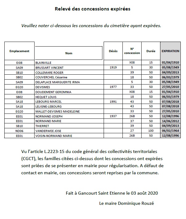 Concessions expirées au cimetière Le 5 août 2020 par djacky76dans Cimetière, INFORMATIONS LOCALES, NEWSLaisser un commentaire Partager : Imprimer(ouvre dans une nouvelle fenêtre) Imprimer Email a link to a friend(ouvre dans une nouvelle fenêtre) E-mail Partager sur X(ouvre dans une nouvelle fenêtre) X Partager sur Facebook(ouvre dans une nouvelle fenêtre) Facebook J’aime chargement…