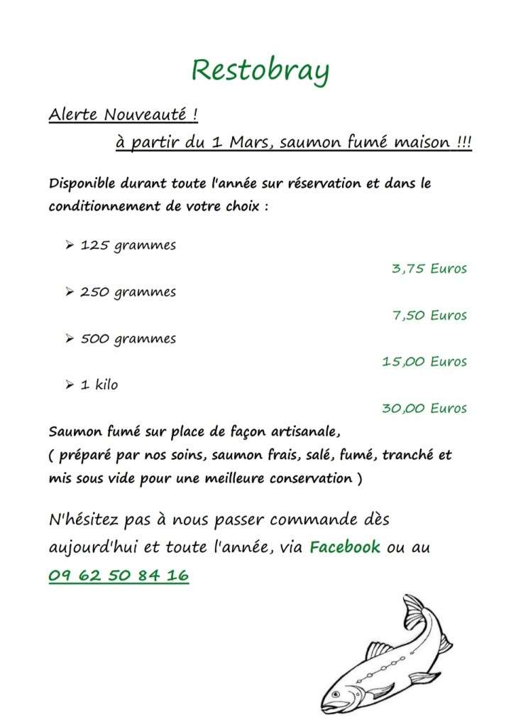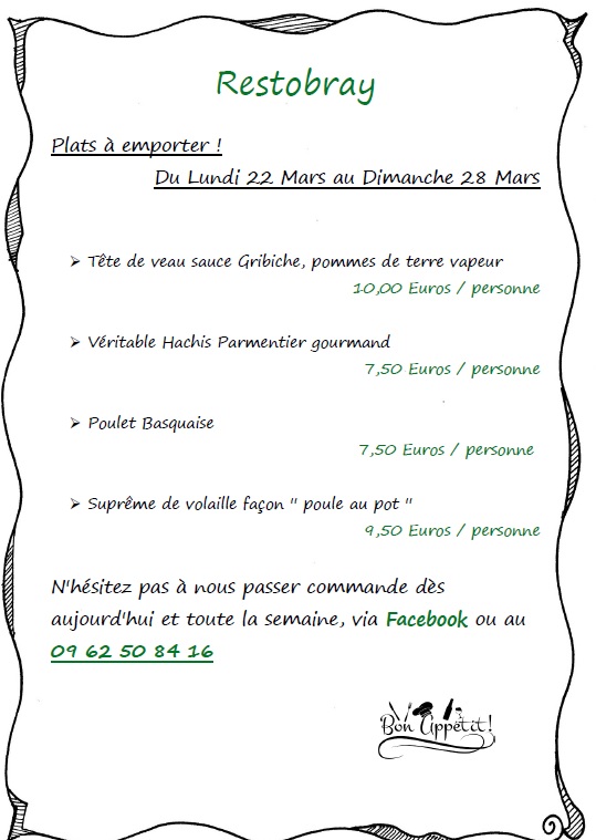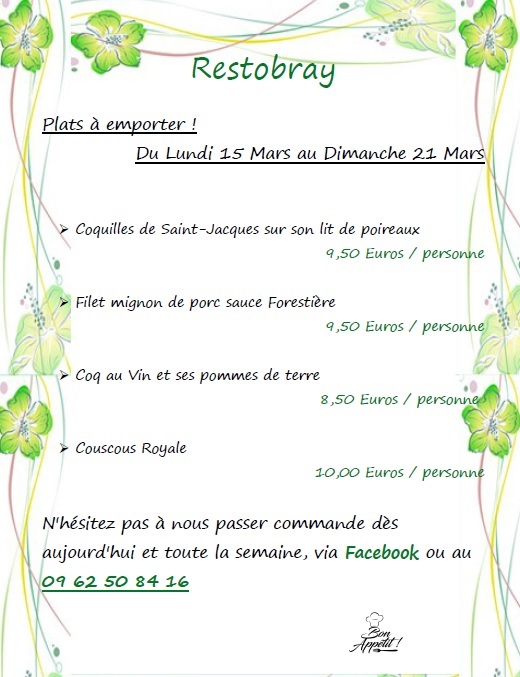 Restobray est réouvert depuis le 22/02/2021 pour des plats à emporter. Thomas et Amélie vous accueillerons pour la réservation de vos plats en attendant la réouverture des restaurants que nous attendons avec impatience. ci-dessous les menus proposés